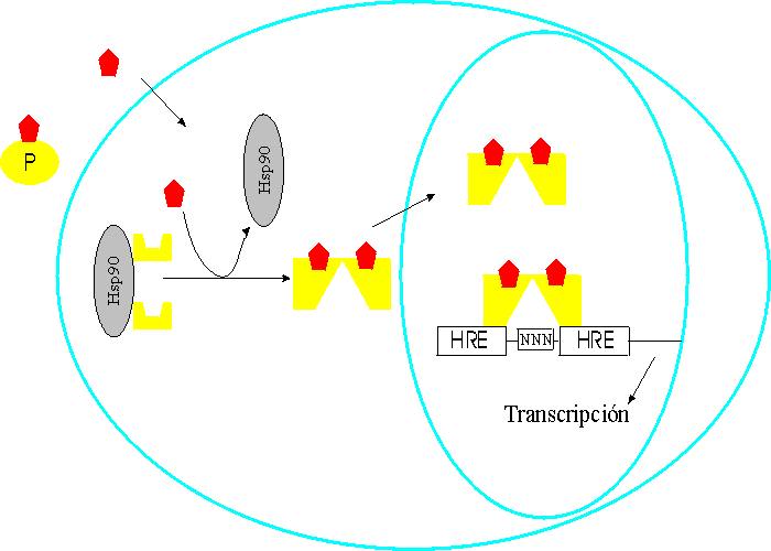 Las hormonas esteroideas son transportadas por proteínas plasmáticas hasta la célula diana. Una vez en su interior, se unen a su receptor, provocando en él un cambio conformacional que lo hace disociarse de la proteína a la que estaba unida (la llamada hsp 90 -heat shock protein) y dimerizar consigo mismo. El homodímero formado se transloca al núcleo, donde se une a una secuencia palindrómica de ADN, conocida por el nombre de elemento de respuesta a hormonas (Hormone Response Element), para activar la transcripción. Esta secuencia de ADN consta de dos motivos específicos separados por tres pares de bases (HRE NNN HRE).