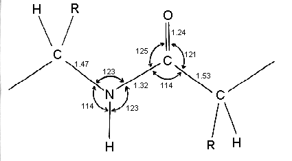 Linus Pauling and Robert Corey analysed the geometry and dimensions of the peptide bonds in the crystal structures of molecules containing one or a few peptide bonds. Their results are summarised in this diagram where the consensus bond lengths are shown in Angstrom units. Bond angles in degrees are also shown for the peptide N and C atoms.