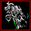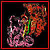 In order to visualize how two monomers pack together to form a dimer, we will concentrate on the positions of the side chains of His-105 and Tyr-286. The face of the histidine of one subunit stacks against the tyrosine of the other, and vice-versa. To highlight these, type the RasMol commands: