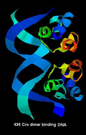 The major groove of the B-DNA is widened at the ends of the binding region where the recognition helices interact, and is narrowed at the centre; the DNA is distorted. The local DNA conformation induced by Cro is different to that which occurs when the repressor fragment (see below) is bound; this is the basis of the different affinities of Cro and repressor for the different protein binding regions.