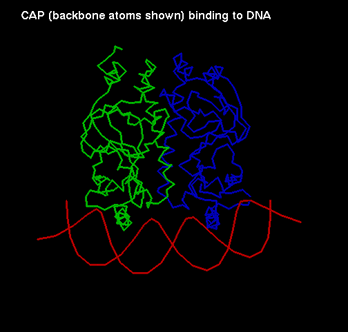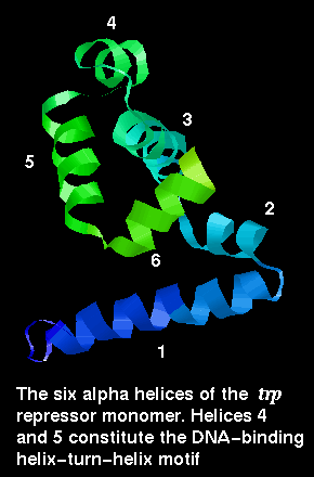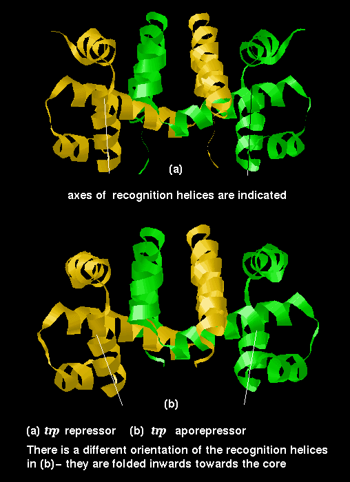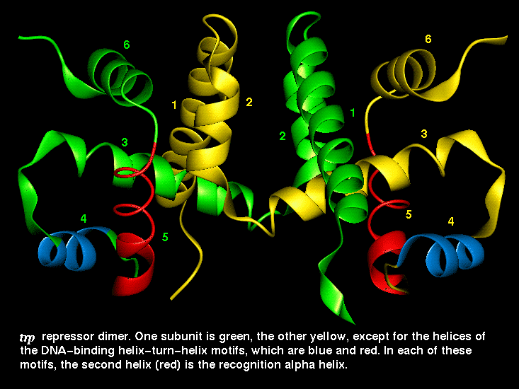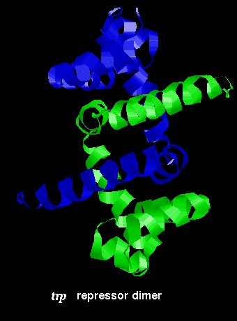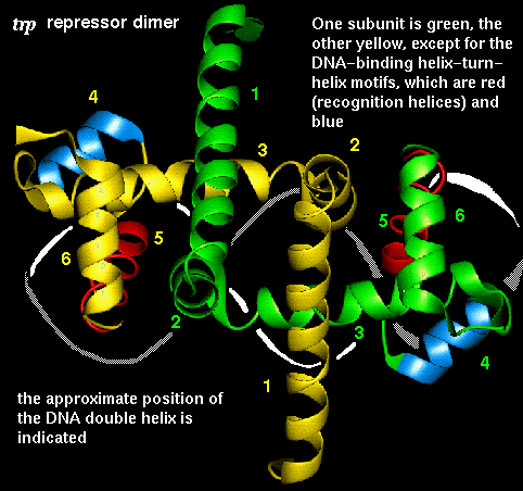 The trp repressor binds to the operator region of the gene for L-tryptophan. The regulation of this gene involves negative feedback: trp repressor only binds to DNA when a L-tryptophan molecule is bound to each subunit. Each tryptophan binds between helices 3 and 5 and causes an allosteric change in the protein conformation so that its helices are in the correct orientation, 34Å apart, for interaction with the major groove. In the absence of tryptophan, the recognition helices are folded inwards towards the central core of the protein and they no longer can simultaneously fit into the groove. Therefore the repressor cannot bind, and L-tryptophan synthesis proceeds.