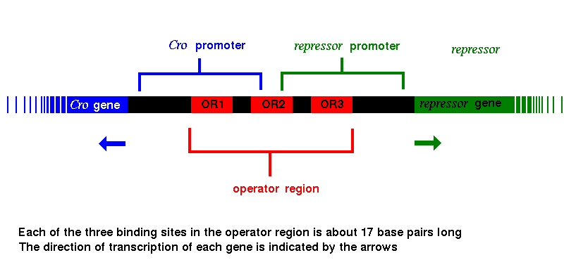 The proteins encoded by both the Cro and repressor genes bind to all three of these sites, but Cro has the highest affinity for OR3, while repressor binds most favourably to OR1. When Cro binds to OR3, RNA polymerase cannot bind to the promoter region of the repressor gene, which can therefore no longer be transcribed, so that the repressor molecule is no longer produced. In the same way, with repressor protein bound to OR1, RNA polymerase is blocked from binding to the promoter of the Cro gene, and Cro synthesis ceases. Various genes involved in triggering the lytic phase lie beyond the Cro gene; their transcription is therefore also prevented by the repressor.