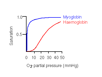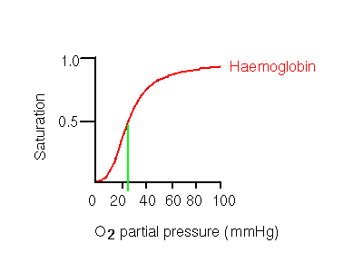 The significance of the sigmoidal curve is that it means that haemoglobin A becomes highly saturated at high oxygen partial pressures, and releases a significant amount of oxygen at pressures which are fairly low, but not extremely so. Contrast this to the hyperbolic myoglobin curve, where even at the low partial pressure of 20 mmHg, the oxygen-carrier is still almost totally saturated. 20mmHg is in fact the partial oxygen pressure in the capillaries of active muscles. Aterial pressure is 100mmHg. Haemoglobin A is 50% saturated at 26mmHg, while 50% saturation of myoglobin occurs at only 1mmHg.