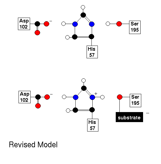 Initially, a proton was thought to be transferred from His 57 to Asp 102; in this scenario the charge on the Asp side chain would therefore be relayed to the serine O-gamma during catalysis, since the latter's hydrogen ion is transferred to the His.