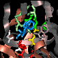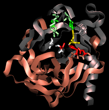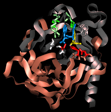 The following diagrams are of chymotrypsin complexed with a tripeptide (crystal structure 8gch).