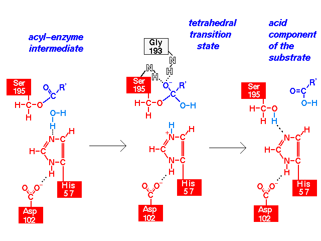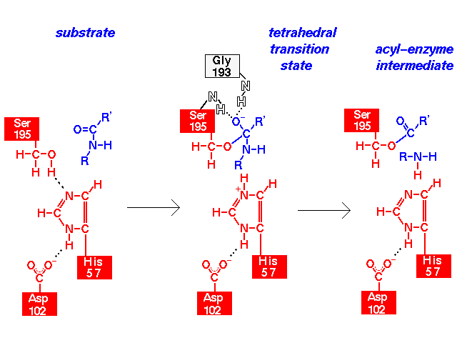 Firstly, the nucleophilic OG of Ser 195 attacks the carbonyl carbon