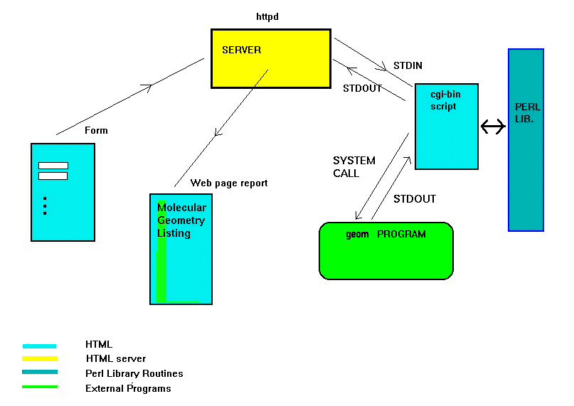 This indicates that the deamon should send all information to the file geom.pl which is located in the /cgi-bin directory. You may remember that the extension .pl indicates a Perl program. Perl is commonly chosen to interpret HTML forms because it is easy to write and modifiy and because it interfaces very easily with HTML ! The Perl CGI routines (and others) are easily available on the Web - this saves you from reinventing the wheel.