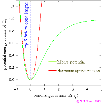 Shown as red line is a harmonic fit to the Morse potential around the equilibrium position: showing how, in this case, Hooke's law can be used as a useful approximation.