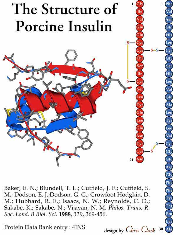 The 4ins.pdb image is half of an insulin dimer. The dimer arises from the crystal. They are not linked in any way, but form a beta-sheet on each monomer. To my knowledge, insulin does not function biologically as a dimer.