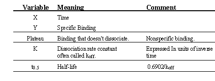 - · The dissociation rate constant, koff or k1. Some people are surprised to find that the observed rate of association depends in part on the dissociation rate constant. During the incubation, radioligand is binding to the receptors and radioligand is dissociating from receptors. The system reaches equilibrium when the two rates are equal. So the observed rate of association measures how long it takes to reach equilibrium. If the radioligand dissociates quickly from the receptor, equilibrium will be reached faster.