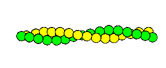 The globular monomeric form is called G-actin, and has a bound calcium ion and a bound ATP molecule, which is hydrolyzed when the monomers polymerize to form F-actin . Electron micrographs indicate the parallel double-helical form of these filaments. Each turn of the helix has 13.5 monomers, and is 360Å long. The diameter is approximately 70Å. The structure is indicated below.