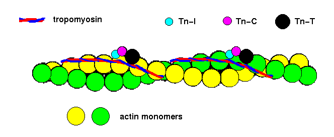 Actin filaments are the major component of thin filaments of muscle tissue. Each group of seven monomers in one strand of the helix has a bound molecule of tropomyosin, and one bound molecule of each of three troponin peptides: Tn-T, Tn-I and Tn-C: