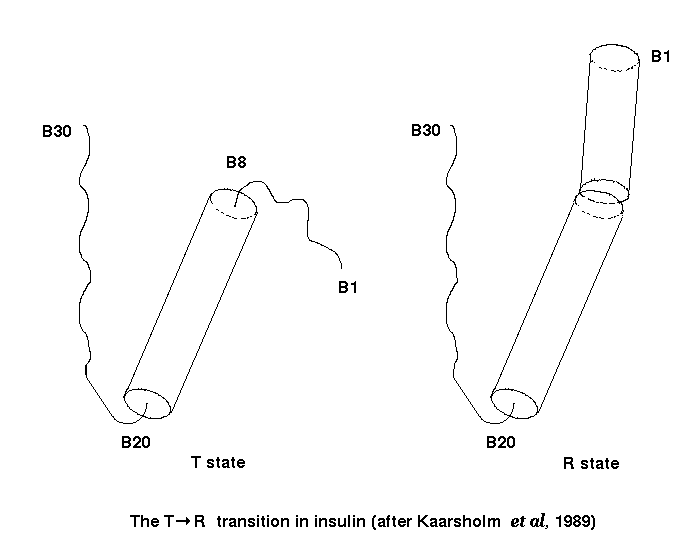 That these conformational variations are not simply due to crystal packing forces is demonstrated by molecular dynamics simulations performed in vacuo which highlight relative movement of the helices and flexibility of the chain termini (Kruger et al. , 1987; Caves et al., 1990). The T to R transition can be reproduced reversibly in the restricting environment of the crystal lattice, demonstrating the flexibility inherent in the insulin molecule (Bentley et al. , 1978). The T to R transition does not appear to be important in receptor binding since gamma-ethylnorleucine B6 insulin, which has limited ability to undergo the transition, still binds the insulin receptor with high affinity (Nakagawa and Tager, 1991).