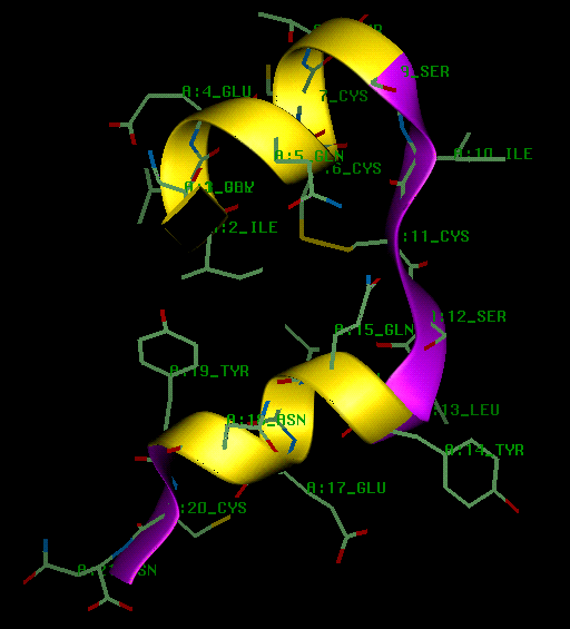 The A chain consists of two anti-parallel stretches of imperfect alpha helices (A2 Ile - A8 Thr and A13 Leu - A19 Tyr) which are joined by a turn from A9 Ser to A12 Ser, stabilized by the A6-A11 disulphide. The A chain lies in a plane in which the N and C terminii are brought to the same side, bringing A2 Ile and A19 Tyr into van der Waals contact (see diagram).