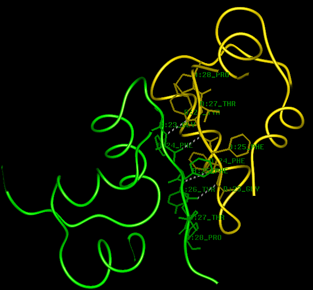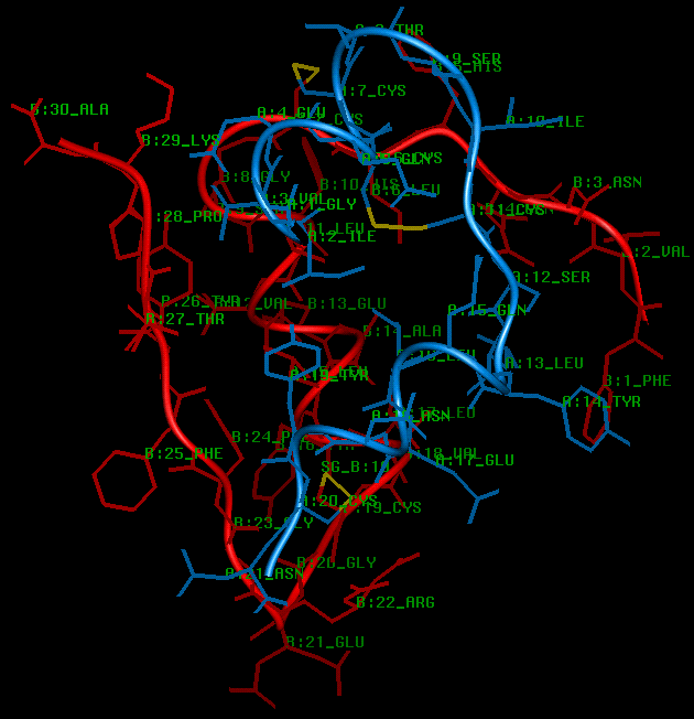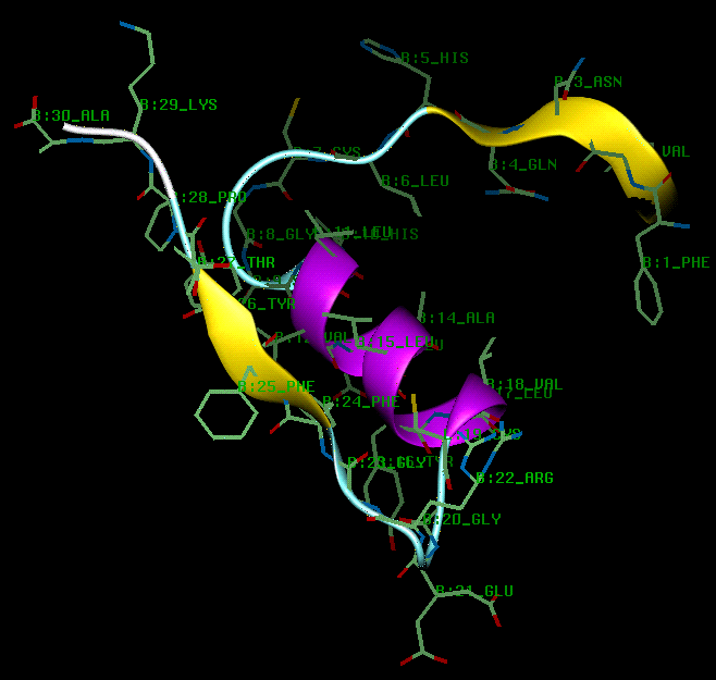 The B chain consists of an alpha-helix (B9 Ser - B19 Cys) from which both N and C terminii residues extend. The glycine residues at B20 and B23 allow the chain to fold back on itself in an approximate V- shape, and this brings the C terminal residues B24 Phe and B26 Tyr into van der waals contact with B15 Leu and B11 Leu of the alpha-helix (see diagram).