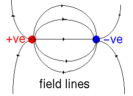 (At zero frequency and room temperature unless otherwise indicated. Source: CRC handbook except for ice value from Fletcher, N.H. (1970) The chemical physics of ice CUP, Cambridge)The source of dielectric effects is that the electric field polarizes the material involved. Suppose that we have two charges interacting in a vacuum. We can draw the electric field lines (the direction in which a positive charge would be forced to move) thus: