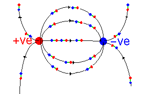 These charges are then placed in a dielectric medium - which can be thought of as being composed of a large number of microscopic dipoles (a little rod with positive charge at one end and negative at the other). These line up along the field lines: