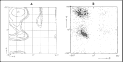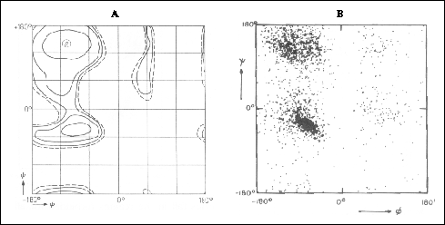 Figure 19. Ramachandran diagrams showing (A) the potential energy distribution in the phi, psi plane for a pair of peptide units with an Ala between and (B) a plot of the backbone dihedral angles phi and psi of about 2500 residues in 13 proteins. Both (A) and (B) are taken from Schulz & Schirmer, 1979. In (A), countours are drawn at 1 kcal/mole intervals from negative to zero (dotted).