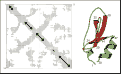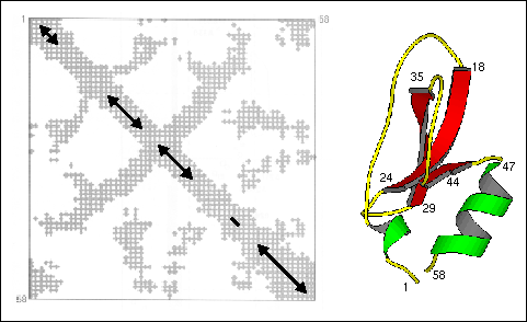 Figure 20. Distance plot (contact map) of bovine pancreatic trypsin inhibitor (left). Distances shorter than 10 Å between alpha carbons are marked with a cross. The approximate positions of the secondary structure elements are indicated on the diagonal (helix:3-6 and 47-58; sheet: 18-24, 29-35, and 45). Taken from Creighton, 1993. For comparison, the three-dimensional structure of BPTI is shown with selected residue positions labeled.