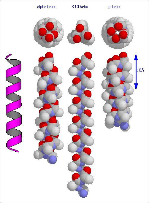 Historically (Brag, Kendrew & Perutz, 1950), helices were often designated by the number of residues per helical turn and the number of atoms in one hydrogen-bonded ring (as a subscript or following a decimal point but here due to formatting limitations of html, I will have to use parenthesis). Thus the alpha, 3.10, and pi helices were designated 3.6(13), 3.0(10), and 4.4(16), respectively. This nomenclature persists only for the 3.10 helix since it can lead to ambiguities (e.g. 3.6(13) and 3.7(13) are both alpha helices).