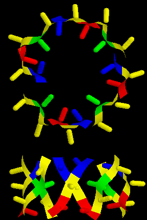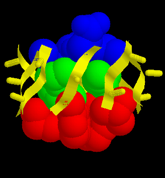 The residues in each of the three layers are coloured blue, green and red. The orientations of each side chain are indicated. The RasMol script defines the layers as the sets top, middle and bottom, and all three collectively as core. After select-ing one of the sets, use spacefill to display the sidechains. For example to display the whole core, cut-and-paste the following: