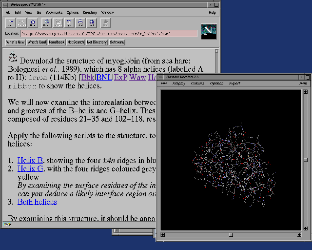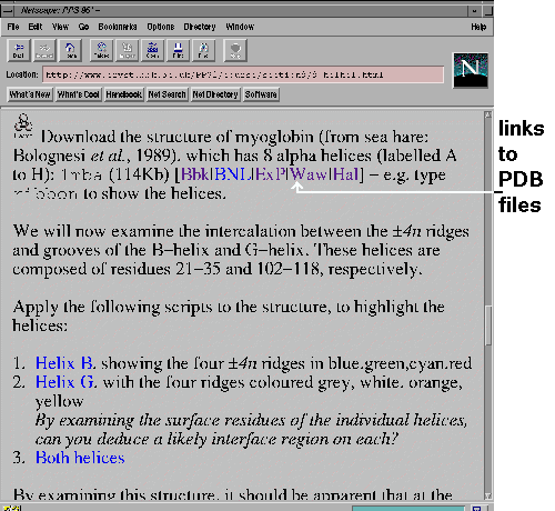 they point to the same PDB file (in this example for the structure 1mba) in different copies of the Brookhaven Data Bank on the World Wide Web. Use the one closest to you. (Three of these sites also have the PPS Course on the same server.) Clicking on the link will download the PDB file stamped with the chemical/x-pdb MIME type (or chemical/pdb in the case of ExP) and so will automatically invoke RasMol, if you have your WWW Browser correctly configured.
