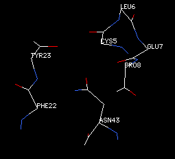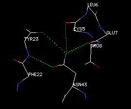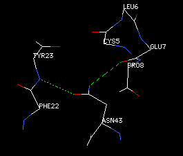 What energy minimization cannot do? Energy minimization is good to release local constraints, "make room" for a residue, but it will not pass through high energy barriers and stops in a local minima. An example of the limitation is presented below: As you can see, Asn43 is making a nice H-bond network with its environment (left image). What happens if we use the "Mutate" tool of Swiss-PdbViewer to find which rotamer would best fit in this place? Rotamer 13/16 is selected, as it makes a similar H-bonding network (right image).