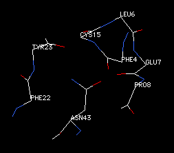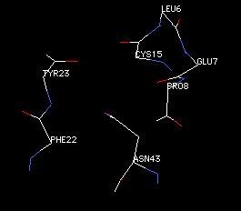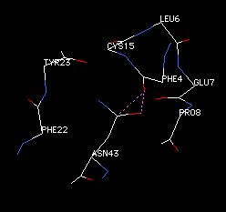 Now select the next rotamer (14/16). It is a simple flip of the N and O atoms, which prevents the sidechain to make any H bonds (left image). Let's apply 400 cycles of Steepest descent (allowing only the Asn43 to move). As you can see (right image) the energy minimization was not able to flip the N and O atoms in order to restore a proper H-bonding network. The same is true if we start from another sub-optimal rotamer.