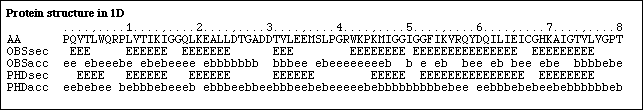 PHDsec predice la estructura secundaria a partir de alineamientos múltiples de secuencias. Las predicciones se hacen a través de un sistema de redes neuronales (fiabilidad = 72%, Rost & Sander, PNAS, 1993 , 90, 7558-7562; Rost & Sander, JMB, 1993 , 232, 584-599; and Rost & Sander, Proteins, 1994, 19, 55-72). | Ejemplo [Output] |