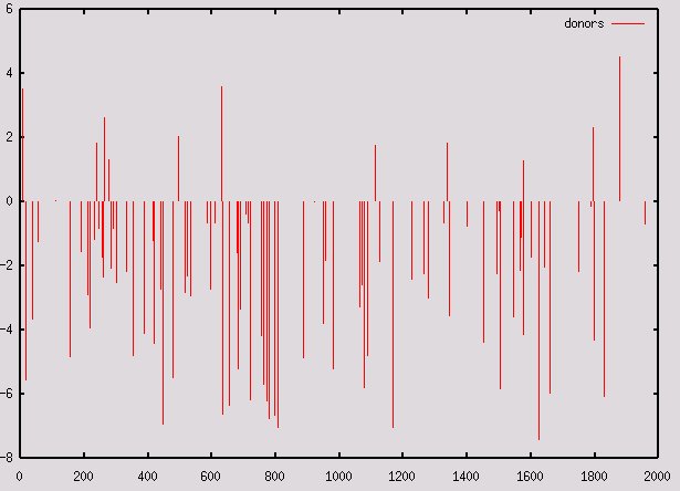 We can run an sliding window window along the query seqeunce above, and compute this log-likelihood ratio on each window. Below the plot obtained when the window size is 120 pb.