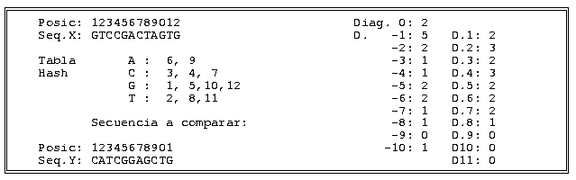 Si hacemos lo mismo con una secuencia Y, ahora cuando comparemos X e Y sólo tendremos que recorrer una vez la secuenca Y, y por cada elemento de ella, tantas posiciones como se indique en la tabla de dispersión de X. Dicho de otro modo, si Y empieza por una C, no tenemos que mirar una a una todas las posiciones de X para ver donde hay una C, ya que ya hemos construido una tabla y podemos ver directamente, en la fila de las C, que en X hay una C en las posiciones 2 y 6.