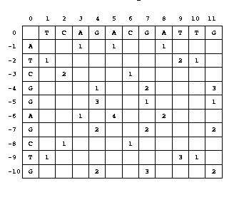 La búsqueda del mejor alineamiento la haríamos quizás en las diagonales -1, 2 y 4, olvidándonos del resto. No garantiza el resultado óptimo pero casi siempre funciona, y es mucho más rápido.Gracias a estos truquillos, el tiempo de comparación de O(NxM) de la programación dinámica de Needleman&Wunsch se reduce a O(N+M), siendo N y M la longitud de las secuencias.