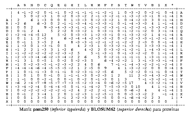 - la composición de aminoácidos de las secuencias alineadas: por ejemplo, si ambas secuencias tienen muchas Cys y éstas en la matriz de sustitución suelen tener puntuaciones más positivas que otros aminoácidos, una puntuación alta de tal alineamiento será menos significativa.