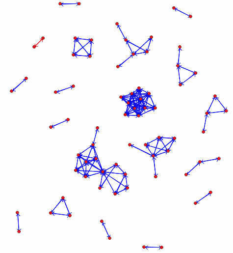 The output of blast2adjLists-ed1.pl is an adjacency list like the one in the example previously given: it contain a list of nodes, and for each of them, a list of the connected neighbor nodes. It is easy to modify the script to generate a different output, for example, an adjacency matrix.