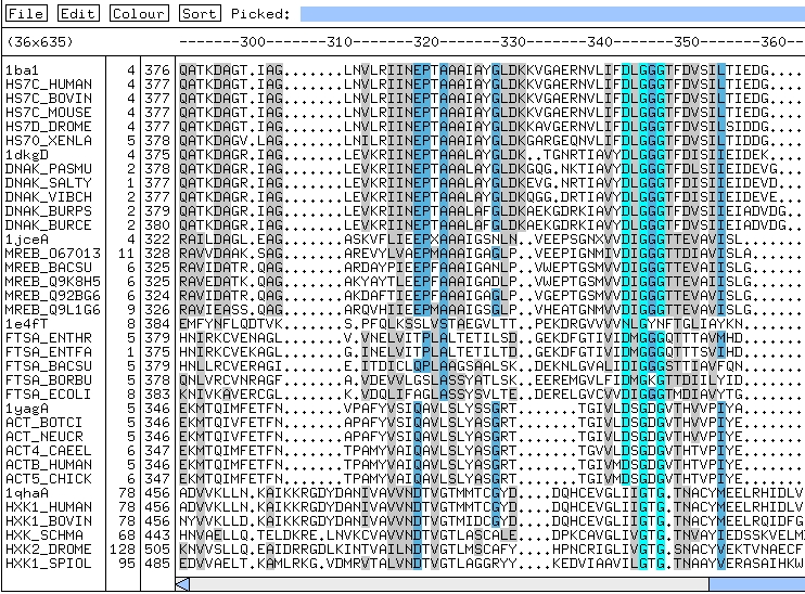 Alineamiento de proteínas de unión a ATP. Algunos residuos están conservados en todas las familias mientras que otros varían mucho.