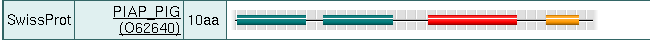 Vemos que la proteína PIAP_PIG tiene varios dominios. Los dos primeros (los azules) son "BIR repeats" (si ponemos el ratón encima aparece una etiqueta que lo indica), luego está el dominio CARD y luego el dominio Zn-finger de tipo RING.