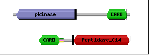 En el enlace "overview" (y en "...sorted by name" y en "detailed") se muestra gráficamente en qué regiones de cada una de las 135 proteínas aparece cada uno de los dominios Pfam, Prosite y Smart. También se muestra qué otros dominios presentan cada una de las 135 proteínas.  Vemos que entre esas proteínas algunas presentan el dominio "proteína kinasa", otras el dominio "caspasa", etcétera. En "detailed" se muestra lo mismo pero más ampliamente. Por ejemplo, en la parte de "overview" vemos esto para la proteína RIK2_HUMAN: