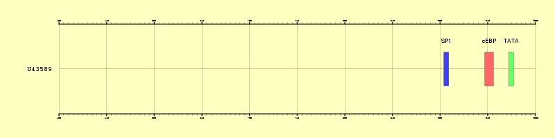 Figure 3. Graphical representation of predicted binding sites using MATCH + TRANSFAC in the promoter sequence U43589 (all of the predictions are not shown)