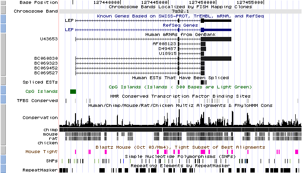 Abstract: In this exercise, the previously annotated promoter region of the Leptin gene (obese protein gene) will be used to test different methods for predicting regulatory elements. First of all, a matrix will be constructed from a real collection of sites. Secondly, the TRANSFAC database will be accessed to extract real matrices and then, the promoter sequence will be scanned searching for promoter motifs. Finally, due to the number of false positives that will be obtained, a phylogenetic approach will be suggested. Both human and mouse homologues will be aligned to elucidate the coordinates of the actual binding sites.