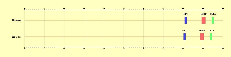 Figure 4. Graphical comparison of the annotations in the human promoter U43589 and its homologue in mouse (500 bps upstream the TSS)