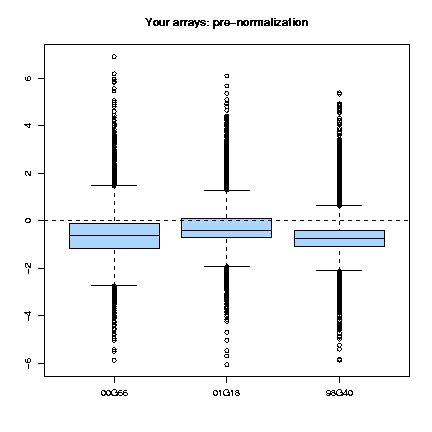 You can enter either a number of individual GPR files or a compressed file containing all the arrays in GRP file format.As resutls, you are given the box-plots of the log (base 2) ratio before and after print-tip loess normalization. This allows you to assess the need for slide scale normalization (a normalization that will ensure the same scale for all arrays).