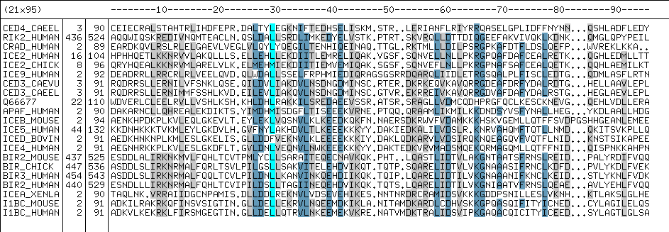 *Cuestión: sabemos que esta proteína interacciona con apaf-1 (se dice en la entrada de Swiss-Prot). Buscando con SRS en Swiss-Prot por "description=apaf-1" + "organism name=Homo sapiens", identificamos la entrada correspondiente a apaf-1, que es la de APAF_HUMAN. ¿cómo crees que se produce la interacción entre ambas proteínas (caspasa-9 y apaf-1)?[CARD, dominios; caspase, dominios]