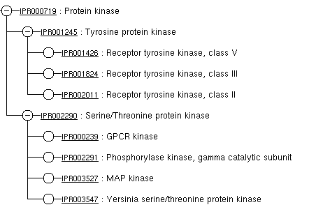Búsqueda en InterPro.Breve introducción acerca de InterPro: hemos visto que en Pfam se describe un grupo que contiene varias subfamilias. En otras bases de datos de estas características (Prosite, SMART, PRINTS, ProDom, TIGRFAMs...) los grupos pueden aparecer definidos a otros niveles. Por ejemplo, puede ocurrir que un grupo de Pfam se corresponda con varios grupos de PRINTS. Y puede ocurrir que un grupo de Prosite se corresponda con varios de Pfam. Cada base de datos refleja la jerarquía de relaciones en superfamilias-familias-subfamilias a un nivel distinto. En InterPro se ponen en conjunto los datos de las distintas bases de datos. Por ejemplo, para las proteínas kinasas existe esta jerarquía:
