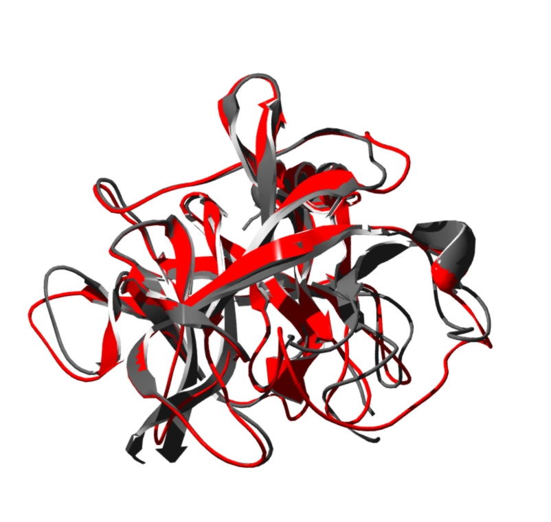 Here you can see in the image the model (RED) and one target (1bruP) in grey. These are predictions, so any conclusion must be taken carefully. (HERE Access to an e-mail with the 3D coordinates.). Note that several templates have been selected to generate the model although in the figure only one is represented. |