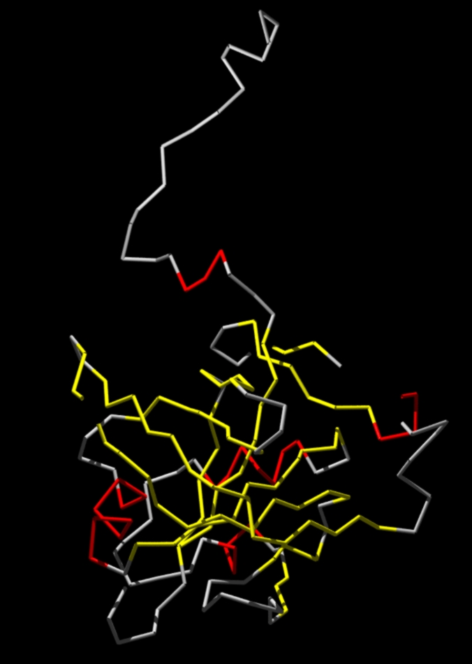 structure YELLOW: B-Strands. RED: Helices. GREY: No secondary structure elements. Note the loops (are missing) |