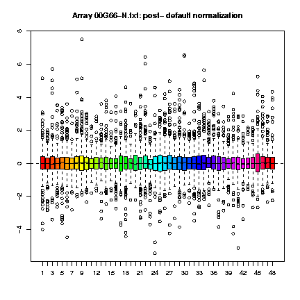 Fig. 1: Boxplots by print-tip-group of the pre- and post-normalization log-ratios M for the 00G66-N.txt array.