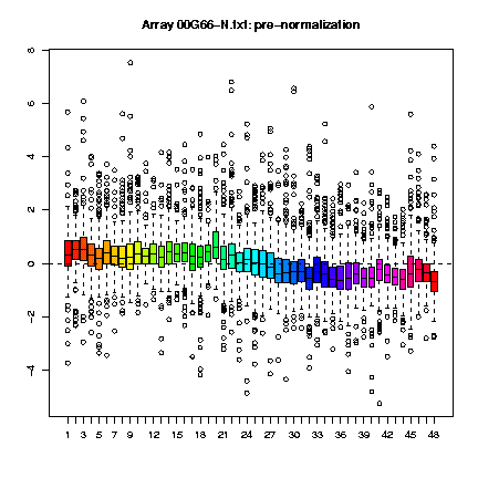 Those plots consist, as cited in Dudoit & Yang (2002), "of the median, the upper and lower quartiles, the range, and individual extreme values. The central box in the plot represents the inter-quartile range (IQR), which is defined as the difference between the 75th percentile and 25th percentile, i.e., the upper and lower quartiles. The line in the middle of the box represents the median; a measure of central location of the data. Extreme values, greater than 1.5 IQR above the 75th percentile and less than 1.5 IQR below the 25th percentile, are plotted individually." This type of plots can be done for the several slides (fig. 1) or for each slide, representing each print-tip group (fig. 2) and are shown both before and after normalization.