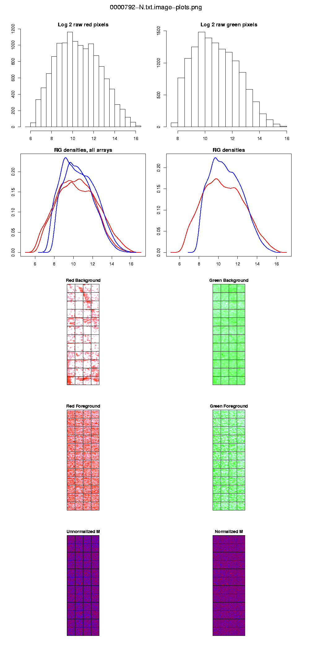 These plots, that include the histograms of the raw intensities for each dye, allow you to check the quality of your arrays. We provide images of the arrays, including the red and green background, and the unnormalized and normalized M. These plots should help you spot damaged arrays, spatial patterns, or miscellaneous strange patterns.