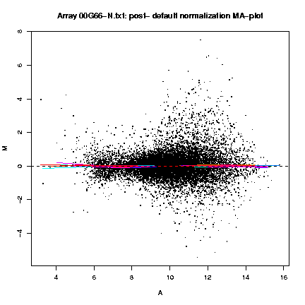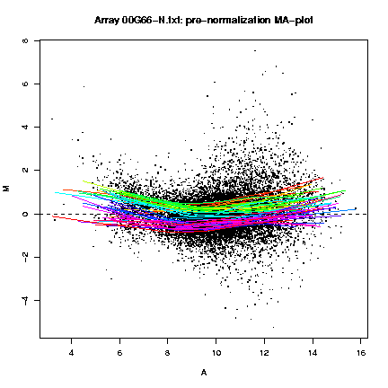 Fig. 1: Pre- and post-normalization MA-plots for the array 00G66-N.txt, with the lowess fits for individual print-tip-groups.