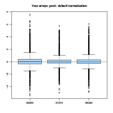 Boxplots by print-tip of the pre- and post- default normalization intensity log-ratios M for each array (download all)